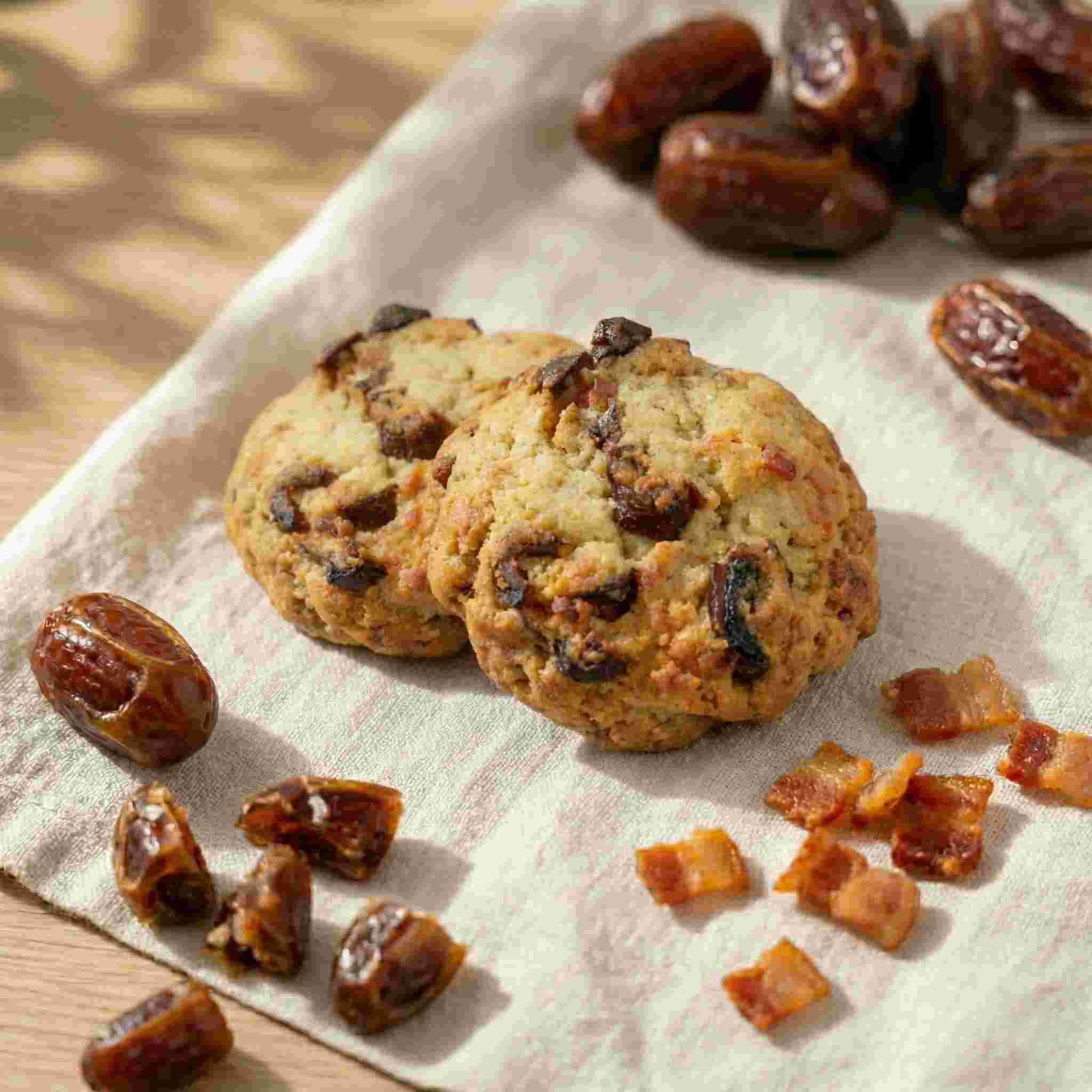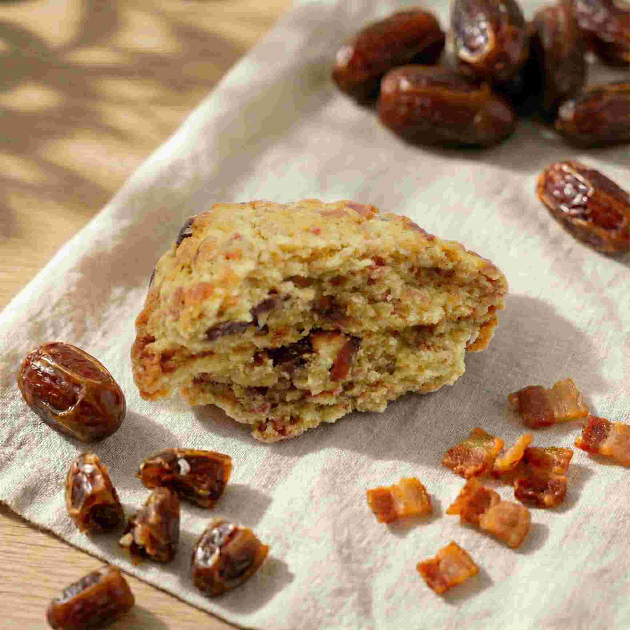 Harina floja ecológica, masa madre, azúcar, mantequilla, huevo, vainilla, impulsor, bacon, dátiles. ALÉRGENOS: Gluten · Lácteos · Huevo